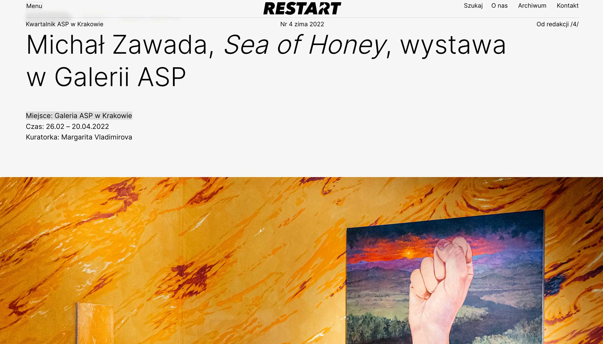 Wystawa Michała Zawady Sea of Honey przedstawia pejzaże dziwnej krainy, opływającej miodem lawy, rozświetlonej zachodami i wschodami słońc, spowitej ciepłem wulkanów. W rozległych dolinach zadomowiły się lasy, gdzieniegdzie płoną pożary i żarzą się samotne ogniska. Unoszą się wzniosłe szczyty gór. Tęcza zatacza łuk nad siedzącym w zadumie gigantem. Wybucha kolejny wulkan. Erupcja wyrzuca wraz z magmą pięści – jako sprzeciw, jako świadectwo, narodziny olbrzyma? Warkocz komety w niebie niczego nie symbolizuje i nikomu nie grozi.