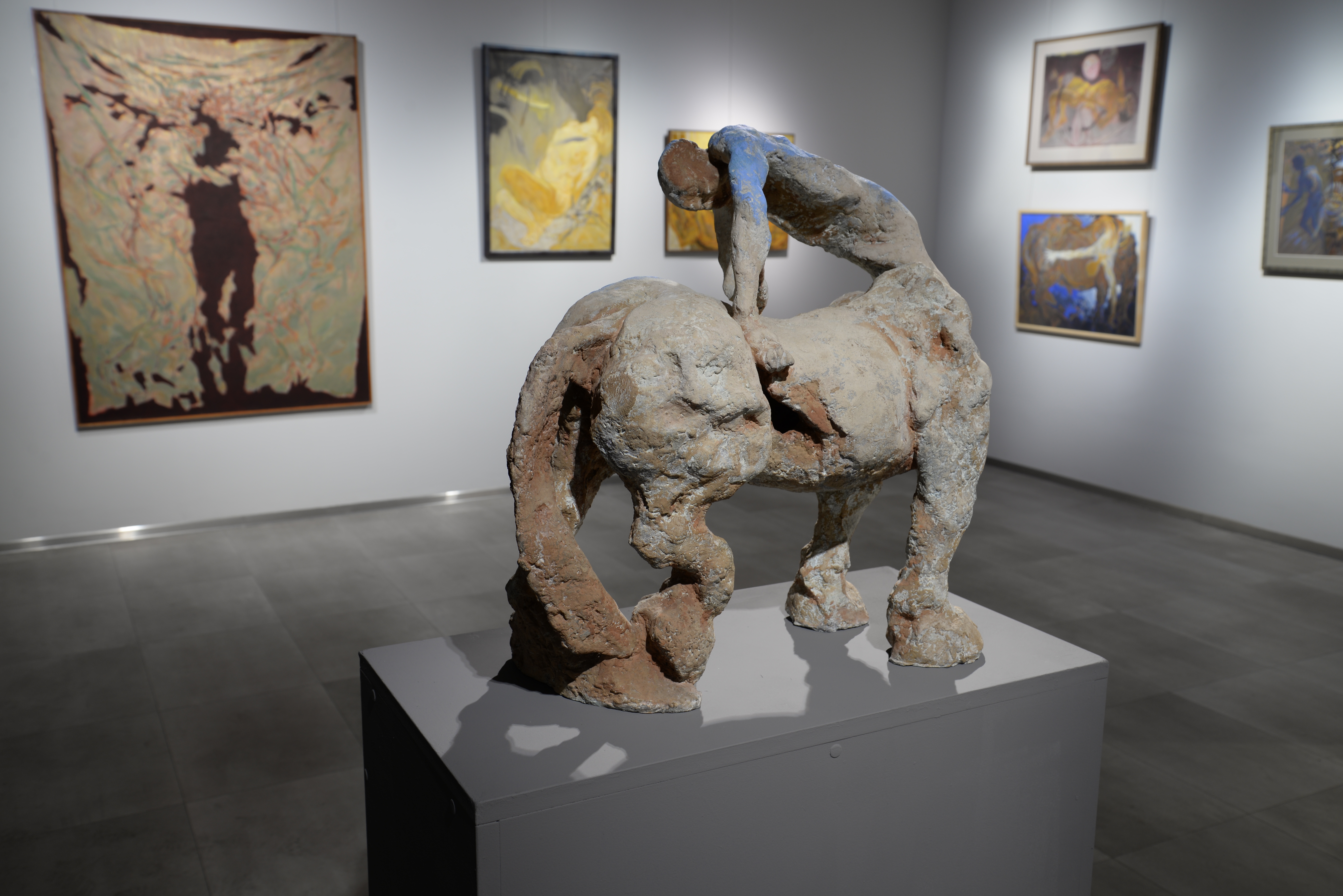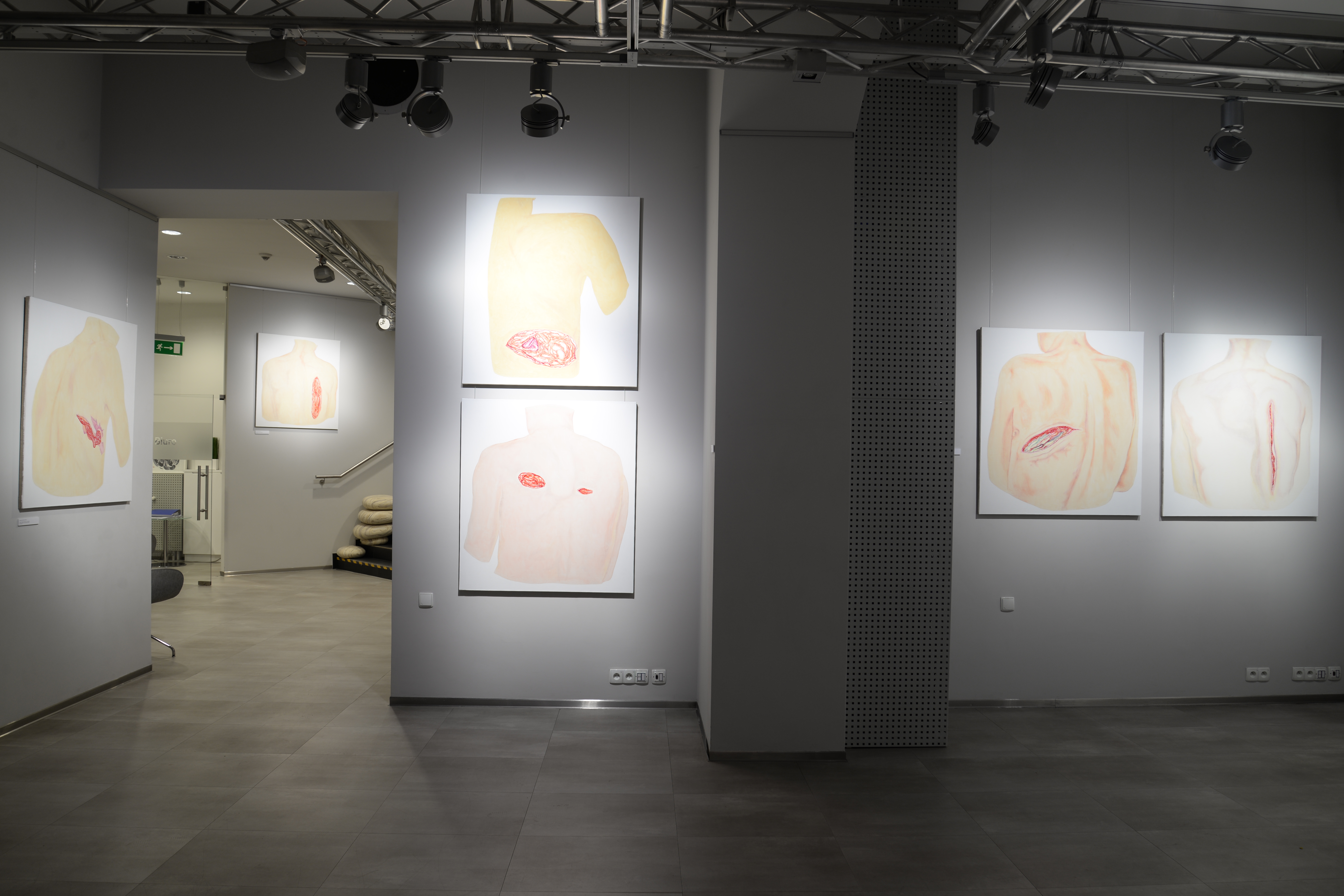 Trzech krakowskich artystów, laureatów prestiżowej nagrody im. J.Cybisa (odpowiednio w latach: 1988, 2002, 2016). Każdy z nich, uwikłany w odmienne koleje zbiorowego losu skupiał swoją uwagę na kondycji człowieka wobec historycznych etapów: powojnia, okresu realnego socjalizmu i współczesnej potransformacyjnej rzeczywistości. Wystawa Sześć stóp nad ziemią jest kameralnym ukazaniem przemian w podejściu do problemu ciała w malarstwie polskim na przestrzeni ostatniego półwiecza, za pomocą prac trzech malarzy różnych generacji.